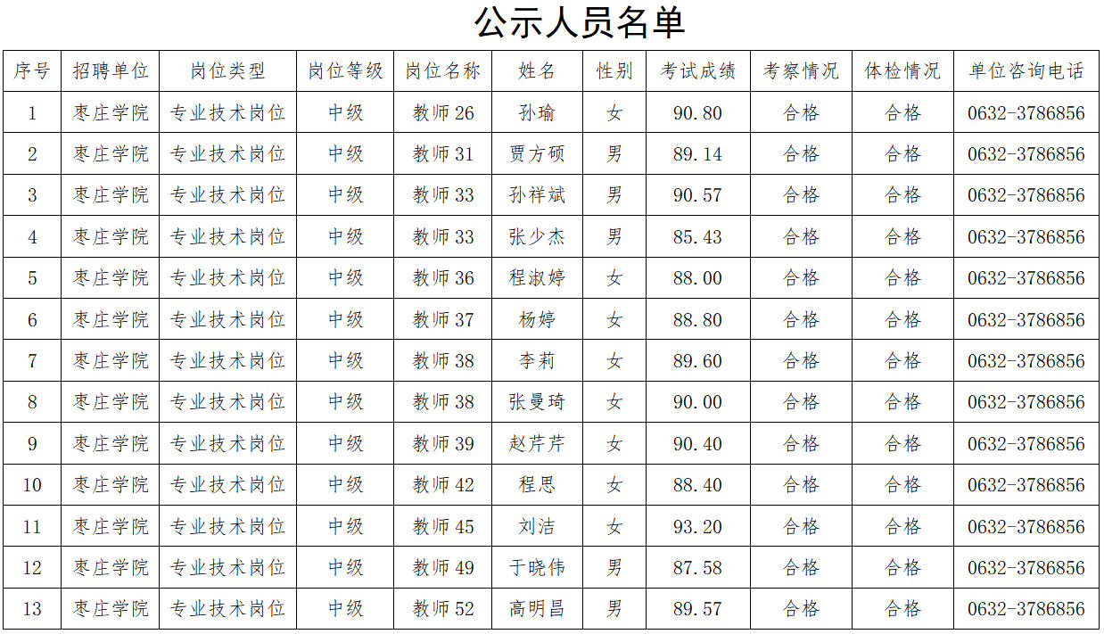 根据省委组织部、省人力资源和社会保障厅《关于印发2025年度省属事业单位公开招聘工作实施方案的通知》(鲁人社发[2024]15号)要求,按照岗位招聘计划,枣庄学院组织完成了公开招聘考试、考察、体检等工作,现对枣庄学院拟聘用人员进行公示。公示期为7个工作日,自2025年7月21日至2025年7月29日(不含节假日)。公示期间,如对公示人选有异议,请及时向省事业单位公开招聘主管机关和枣庄学院反映。