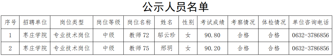 根据省委组织部、省人力资源和社会保障厅《关于印发2025年度省属事业单位公开招聘工作实施方案的通知》(鲁人社发[2024]15号)要求,按照岗位招聘计划,枣庄学院组织完成了公开招聘考试、考察、体检等工作,现对枣庄学院拟聘用人员进行公示。公示期为7个工作日,自2025年11月27日至2025年12月5日(不含节假日)。公示期间,如对公示人选有异议,请及时向省事业单位公开招聘主管机关和枣庄学院反映。