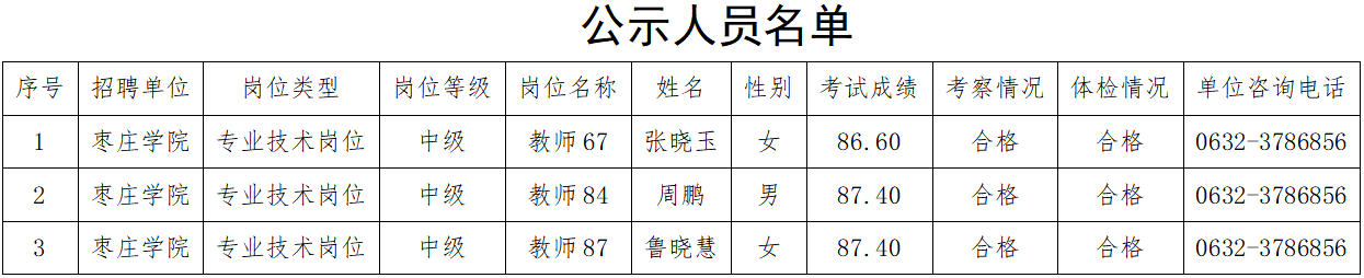 根据省委组织部、省人力资源和社会保障厅《关于印发2025年度省属事业单位公开招聘工作实施方案的通知》(鲁人社发[2024]15号)要求,按照岗位招聘计划,枣庄学院组织完成了公开招聘考试、考察、体检等工作,现对枣庄学院拟聘用人员进行公示。公示期为7个工作日,自2025年12月26日至2026年1月6日(不含节假日)。公示期间,如对公示人选有异议,请及时向省事业单位公开招聘主管机关和枣庄学院反映。