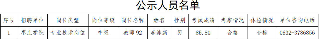 根据省委组织部、省人力资源和社会保障厅《关于印发2025年度省属事业单位公开招聘工作实施方案的通知》(鲁人社发[2024]15号)要求,按照岗位招聘计划,枣庄学院组织完成了公开招聘考试、考察、体检等工作,现对枣庄学院拟聘用人员进行公示。公示期为7个工作日,自2025年12月29日至2026年1月7日(不含节假日)。公示期间,如对公示人选有异议,请及时向省事业单位公开招聘主管机关和枣庄学院反映。