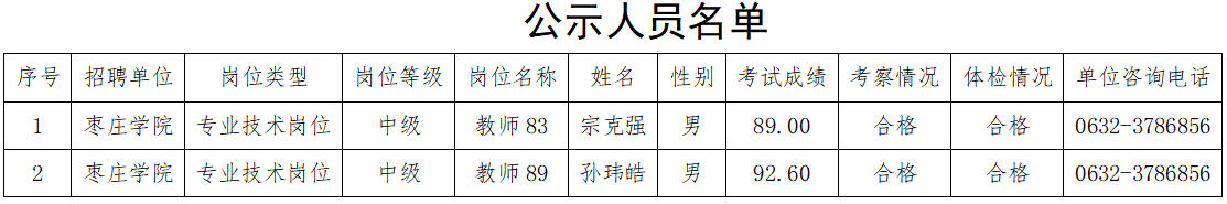 根据省委组织部、省人力资源和社会保障厅《关于印发2025年度省属事业单位公开招聘工作实施方案的通知》(鲁人社发[2024]15号)要求,按照岗位招聘计划,枣庄学院组织完成了公开招聘考试、考察、体检等工作,现对枣庄学院拟聘用人员进行公示。公示期为7个工作日,自2026年2月2日至2026年2月10日(不含节假日)。公示期间,如对公示人选有异议,请及时向省事业单位公开招聘主管机关和枣庄学院反映。