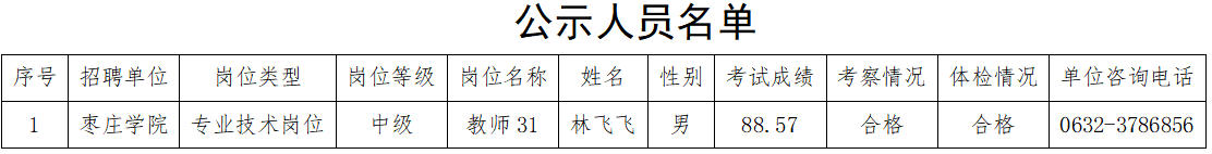 根据省委组织部、省人力资源和社会保障厅《关于印发2025年度省属事业单位公开招聘工作实施方案的通知》(鲁人社发[2024]15号)要求,按照岗位招聘计划,枣庄学院组织完成了公开招聘考试、考察、体检等工作,现对枣庄学院拟聘用人员进行公示。公示期为7个工作日,自2026年3月3日至2026年3月11日(不含节假日)。公示期间,如对公示人选有异议,请及时向省事业单位公开招聘主管机关和枣庄学院反映。